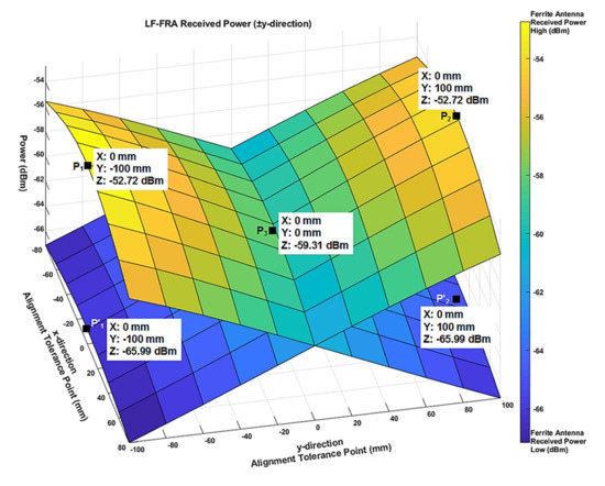 1 have a secondary device located at 0 mm in the x-direction and −100 mm in the y-direction, respectively, among the alignment tolerance areas of the primary device. Here, the ferrite antenna received power of the primary device is −52.72 dBm for ferrite antenna (Rx1) located at −y-direction and −65.99 dBm for ferrite antenna (Rx2) located at +y-direction. It shows that the secondary device is located to the left of the center alignment point of the primary device. Therefore, the secondary device is moved to the right. Similar results were observed for in P