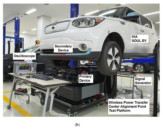 Figure 18b shows a vehicle-level test bench to find the center alignment point within the alignment tolerance area by installing the EV WPT system on a KIA SOUL EV. A ROHDE and SCHWARZ SMC100A signal generator was used to generate magnetic flux density in the ferrite antenna transmitter of the secondary device. The characteristic impedance of the connected to the signal generator to perform the test is 50 ohms. A ROHDE and SCHWARZ RTE 1104 oscilloscope was used to measure the open-circuit voltage in the ferrite antenna receiver of the primary device. The WPT Testing Platform from Chroma [