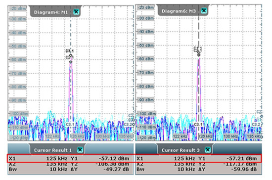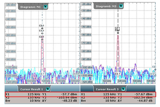 Figure 19, the value of cursor results 1 is −57.12 dBm and that of cursor result 3 is −57.21 dBm. The measurement error guaranteed by the signal generator and oscilloscope is 2% and the difference between the value of cursor result 1 and the value of cursor result 2 is 0.09 dBm. Therefore, in the component-level test, it can be observed that the output of the ±y-direction ferrite antenna receiver mounted on the primary device is the same. Similarly, in the vehicle-level test (see