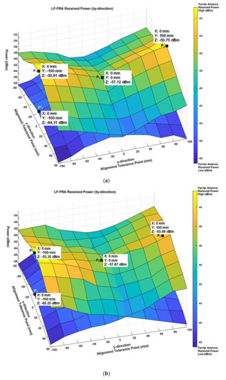 Figure 21a), the ferrite antenna received power of the primary device is −50.91 dBm for ferrite antenna (Rx1) located at the −y-direction and −64.31 dBm for ferrite antenna (Rx2) located at the +y-direction. This indicates that the secondary device is on the left-side of the center alignment point of the primary device. Therefore, the secondary device is moved to the right. Similarly, in vehicle-level (see