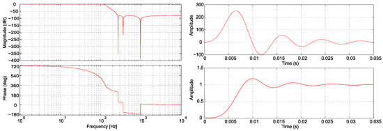 The frequency response of the filter described by (1) is presented in Figure 1. The frequency response depicted in Figure 1 is the same as the frequency characteristic published by JR3 in the technical note [13]. Besides the frequency responses of the considered elliptic filter, Figure 1 presents also its step response and impulse response. It is not difficult to find that the considered elliptic filter is very selective in the transition band. On the other hand, the presented step and impulse response clearly indicate that the transient response of the considered filter is very long. Taking into account the step response of the filter we can observe that the 2% settling time achieves about 28.1 ms and the overshoot reaches 17.94%.