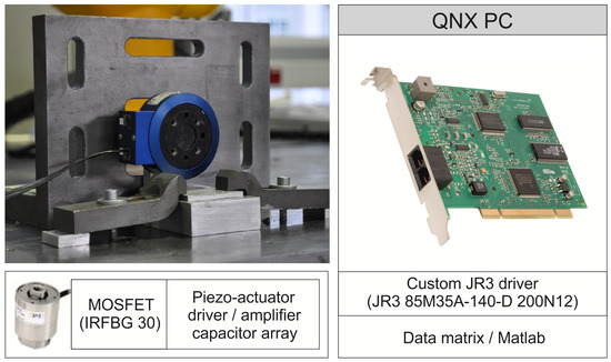The JR3 torque/force sensors clearly contributed to the development of commercial robotic systems that interact with the environment. More and more key manufacturers offer an easy way to expand the robot with the sense of touch. Examples include FANUC company, offering 5 force sensors operating in the ranges from 15 to 250 kg [24]. Regardless of the manufacturer, the mechanical design of the sensor is identical and based on a monolithic, aluminium body [25]. A tensometric bridge is laid out on the surface, enclosed inside the sensor structure with an analogue electronic circuit. The sensor often also includes the digital signal processing part, but this is not a rule set in stone. Figure 2 presents the structure of the experimental setup. It uses a JR3 85M35A-140-D 200N12 sensor with analogue outputs and a PC card, installed on QNX computer. The JR3 sensor was attached to a massive steel block in order to ensure high mechanical stiffness.