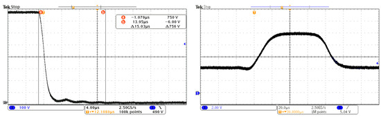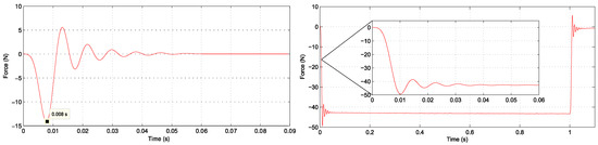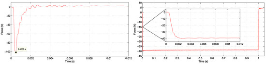 A big challenge was to develop a methodology for generating a step and impulse forces to ensure that the time responses of the sensor are correctly determined. In an ideal case, the step and the impulse generation should not exceed a single sample time of the sensor. It is known that sample frequency of JR3 sensor is 8 kHz, providing a time window of only 125 s. Piezoactuators are ideal elements generating step-like forces. An actuator made by PI P-010.10 with the following parameters was used in the experiment: max. stroke: 15 s, blocking force: 1.8 kN, own mass: 12 g, mechanical stiffness 120 N/m, capacitance 65 nF. The aforementioned parameters enable generation of force profiles with ultra-low rise times. In this configuration, the actuator can be considered as a force-driven mass-spring system coupled to the mass-spring-damper system (approx. mass: 57 g [26]). The key components, additionally reducing the rise time, included a fast switching MOSFET (IRFBG30 with a low -resistance) and a capacitor array charged with a high-voltage amplifier. Figure 3 (on the left) depicts a sharp voltage rise, stabilising after 15 s. The settling of the actuator voltage indicates the settling of the actuator extension and hence the applied force [27]. The recorded actuator step time of 15 s is many times shorter than the minimum sample time of the force/torque sensor, offering correct execution of the experiment.