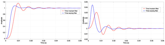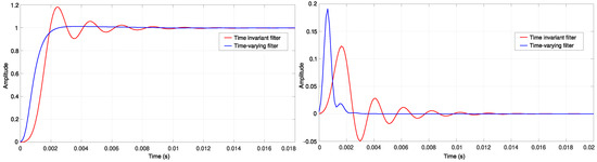 Taking into account previous works on filters with reduced transient response [18,19,20,21], it was assumed that both the undamped natural frequency and the damping ratio are temporarily varied in time in order to improve time domain response of the elliptic filters considered in this work. Taking into account that time-varying systems cannot be described in the frequency domain we have to move to the time domain. The considered elliptic filter with time-varying dynamic parameters can be presented as a system of second order differential equations with time-varying coefficients:
