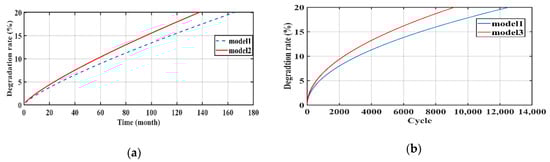 Degradation rate by model: (a) Calendar degradation and (b) cycle degradation.