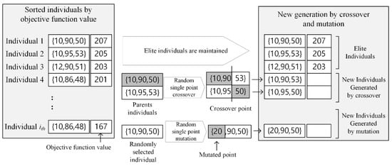 Figure 7 shows the process of crossover and mutation in genetic algorithms. Some individuals with high objective function values are retained in the next generation. The number of individuals maintained by elitism is defined as Nelite. The deleted individuals are generated by the crossover operator and the mutant operator, and the number of individuals is defined as Nco and Nmu. For crossover and mutation, each of the parents is randomly selected from the elite. In the crossover operation, random single-point crossover was applied. Crossover creates two new individuals at a time. In the mutation operation, mutations were randomly generated at random single points. When all individuals are newly created, the objective function calculation and the sorting are repeated. Through such repetitions, one generation would have evolved in terms of genetic algorithms. In this study, the process of evolution was terminated when the objective function values of the best chromosomes did not improve during 10 generations.