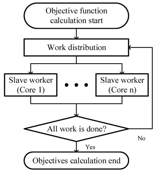 In this study, we used MSPGA to calculate the objective function, which would otherwise take a long time. The MSPGA can be even applied with only one machine in a memory structure shared with many CPU cores, like a general PC. The detailed steps for the calculation of the objective function in Figure 6 are shown in Figure 8.