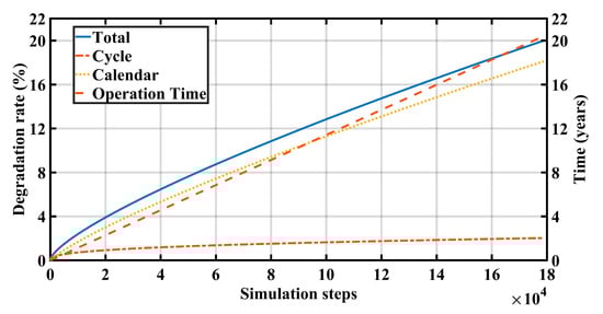 Figure 9 shows the trend in the degradation rate from the results of the simulation, which proceeded until the degradation rate reached 20%, using the parameters in Table 1 and battery model 1 in Table 2. In most cases, calendar degradation accounted for most of the total degradation compared to cycle degradation, resulting in a lifespan of about 21 years. The total degradation rate considering both calendar and cycle degradation was found to be nonlinear.