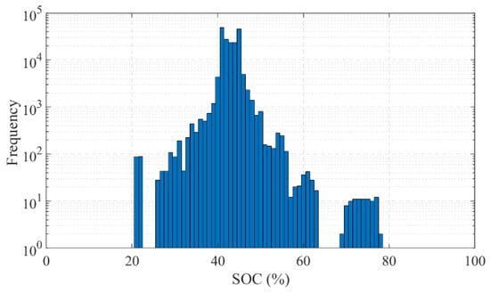 Figure 10 shows the distribution of SOC by setting the scope of SOC operation for the overall lifetime, as shown in the MSPGA case 2 in Table 9. If the frequency is maintained within 60 ± 0.03 Hz, the ESS is set to charge/discharge to maintain the SOC at 43%. Therefore, it can be seen that the SOC distribution is concentrated at 43%. As the frequency rises, the ESS charges and the SOC increases. However, it can be seen that SOC does not exceed 80% over its lifetime. For this reason, it can be confirmed that the objective function value is calculated equally even if Smax is set to any value of 80 to 100.