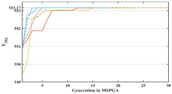 We performed six iterations to confirm that the MSPGA method converged to the same maximum objective value, of 553.17, for each iteration, as shown in Figure 12. Although the convergence speed varied from case to case due to the nature of the genetic algorithm using the random function, the proposed MSPGA was confirmed to converge at a sufficient optimal point.