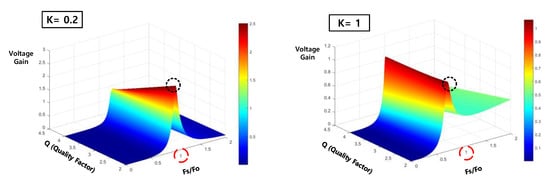The normalized frequency can be defined as . Figure 2 shows the voltage gain of the S-S topology of WPT system, according to the load quality factor and . When , coupling coefficient is stronger than . And also, the can express as (where, is switching frequency and is resonant frequency). When the voltage gain is changed to the following ratio. To obtain the high-voltage gain of the WPT system operating the resonant region (. When , if the coupling coefficient and the quality factor is low, the voltage gain is high. On the other hand, the quality factor is high, coupling coefficient is low, and the voltage gain is low. In other words, when the low coupling coefficient, the low-quality factor has high voltage gain. But high coupling coefficient is not changed by the changeable quality factor.