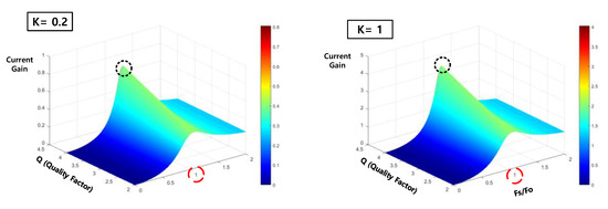 The current gain can express to Equation (12). Figure 3 shows the current gain according to the load quality factor and . The coupling coefficient is (), current gain is low compared with () at the same quality factor. If the Q increases, the current gain also increases. On the other hand, the Q decreases, the current gain also decreases [9,10].