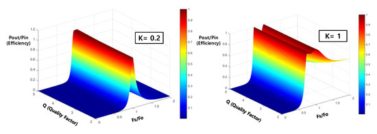 Figure 4 shows the output power and the input power factor according to the load quality factor and . When the coupling coefficient is (), the range of high efficiency is very large compared with (). In case of WPT system, it has coupling coefficient around (). Although, the WPT system has the coupling coefficient around () and various load, if the WPT system is controlling in ZPA region (, it can obtain the high efficiency and power transfer compared with another region. Therefore, the WPT system is automatically working in the ZPA region for maximum output power and high efficiency [11,12].
