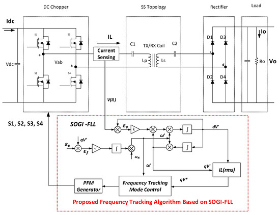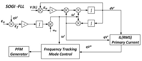 We propose the new WPT system with the frequency tracking algorithm for ZPA operation and the SOGI-FLL. The frequency tracking mode controller is shown in Figure 7. The proposed method has two feedback loops, where the SOGI-FLL provides the primary current and center frequency. The frequency tracking algorithm generate PFM signal based on the frequency and the primary current.