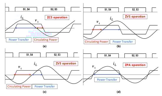 WPT system operation following the switching frequency; (a) ZCS operation; (b) ZVS operation; (c) ZVS operation; (d) ZPA operation.