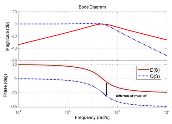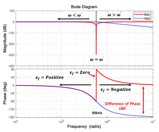 is the error between the input signal and the output signal of the d-axis, is gain and the center frequency is . Using Equation (20), the Bode diagram is shown in Figure 10. When the frequency of the input signal is lower than the center frequency, and are the same phase. That is, the frequency error can be calculated using two signals. When the signal frequency is the same as the center frequency, the becomes zero. When the signal frequency is higher than the center frequency, the has to be negative. As shown in Bode diagram (Figure 11), the negative gain and an integrator are used to make the direct current component of of zero, so that the center frequency follows the input signal frequency. Trapezoidal approximation is applied to obtain the discrete transfer function. It can express the following Equation (21) [22,23,24].