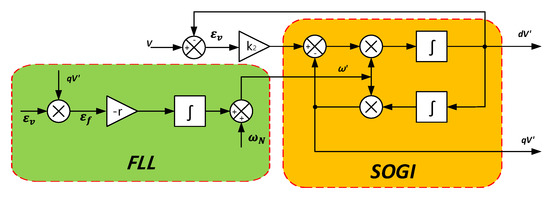 Block diagram of second-order generalized integrator-frequency locked loop (SOGI-FLL).