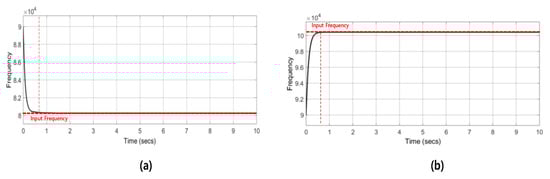SOGI-FLL step response (Frequency estimated value); (a) 80 kHz input frequency; (b) 100 kHz input frequency.