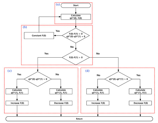 The proposed frequency-tracking algorithm is shown in Figure 13. The algorithm is divided into four parts such as (a), (b), (c) and (d). and also, the step of algorithm has 3 operations such as (a→b), (a→b→c), (a→b→d). this step is decided by the value of , , and . Where, is the present frequency, is the present primary current, is the past frequency and is the past primary current. and also, the proposed algorithm is calculated by digital controller (TMS320F28335). The calculated switching signal generates a PFM signal through a digital controller, and the PFM signal is transmitted to the DC-chopper circuit.