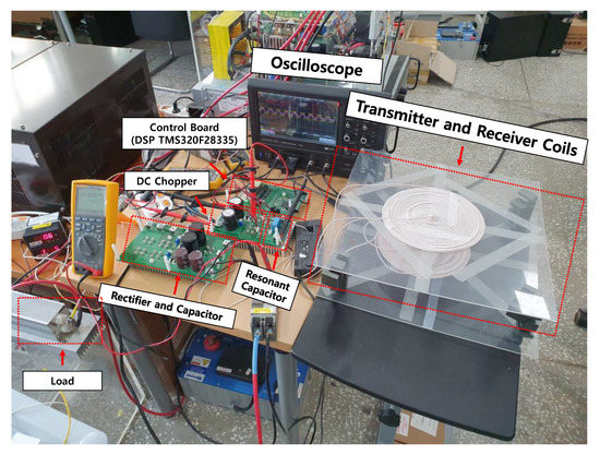 Figure 5 shows the proposed WPT system diagram. The WPT system hardware consists of the direct current (DC) chopper, SS topology, rectifier and load. The DC-link voltage of the WPT system is 50 V. The TX/RX (transmitter/receiver) has SS topology with capacitor and coils. And also, the TX/RX coils have inductance (). The resonant point is decided by capacitor and inductance.