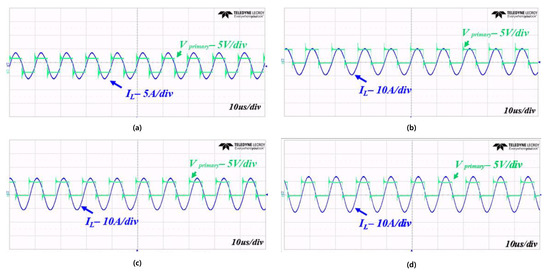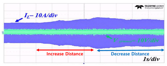 In addition, the variation of the coupling factor shows the variation distance. The coupling factor decreases as the increasing distance. Therefore, the voltage gain increases as the decreasing coupling coefficient due to the resonance characteristics of the SS topology. Comparing with the IL (primary current) waveforms of Figure 15a–d, we can confirm that the current waveform increases as the increasing distance due to the variation of the voltage gain.