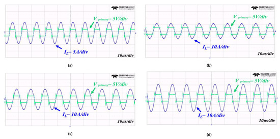 Figure 16a–d shows the primary voltage and current waveforms of the WPT system. The experiment shows the operating waveform on the fluctuation of the distance between the transmitter and receiver coils at 20-ohm load. Compared to Figure 15, the experiment carries out by changing only the load in the same coupling factor. As the load changes, Figure 16 shows the low Q factor (Quality factor ) compared with Figure 15. The changeable Q factor has a changeable voltage gain. Therefore, Figure 16 shows the high voltage gain compared with Figure 15. Therefore, the primary current is increased. We can confirm that it operates by the following ZPA point even though the changeable load.