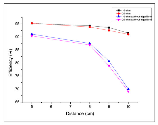 If the algorithm is not applied, the ZPA operation does not work as the distance increases. Therefore, compensation by the SS topology is not properly performed, and has low efficiency. In that case the proposed algorithm efficiency is 91%–95% and without it the proposed algorithm efficiency is around 70%–91%.