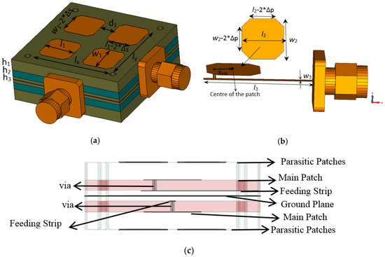 The proposed antenna geometry: (a) wideband MIMO antenna dimensions, (b) feeding structure and location of the via, and (c) side view of the antenna.