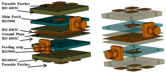 The complete assembly of the two subarray elements with their feeding structure is shown in exploded form in Figure 3. The structure of the feed from the SMA connectors to the respective driven patches is as shown in Figure 1b (where the dielectric is rendered transparent), this structure being chosen to enable widening of the operational bandwidth while leaving the radiation pattern largely unaffected. The stacked structure also permits adjustment of the radiation pattern through modification of the layout of the parasitic patches without the need for alteration of the feed structure. The dielectric between the feed line and the driven patch was chosen to be a 1.28 mm in thickness Rogers Corporation high frequency laminate of type RO3006. The layer beneath the feeding strip was chosen to be a Rogers Corporation 4003C, with a thickness of 0.813 mm.