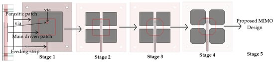 To understand the basic operational principles of this antenna, the evolution process of the design has been divided into five stages, as illustrated in Figure 4. This will help to simplify the analysis of the contribution of each part of the antenna in terms of impedance bandwidth and matching, and gain over the intended wideband operating frequency band (4.5 to 8.5 GHz), as shown in Figure 5. In Stage 1, the antenna consists of a large top parasitic patch and it is excited by a driven patch below it. In this configuration, two resonant frequencies, i.e., 3.1 GHz and 5.8 GHz, can be attained in the S11 plot, as illustrated in Figure 5a. The first resonant frequency is controlled by the length of the parasitic patch (18.5 mm, equivalent to 0.35 λ at 3.1 GHz) while the second resonant frequency is governed by the length of the driven patch (10 mm, equivalent to 0.5 λ at 5.8 GHz). By dividing a single parasitic patch into four patches with each has size of 8.5 mm × 8.5 mm, as depicted in Stage 2 of Figure 4. These four radiating patches on the top of each subarray are parasitically excited through an electromagnetic coupling area located at one of their corners which overlaps with the driven patch below them. This combination structure enables wide bandwidth with acceptable S11 (better than −8 dB) and good gain (above 5 dBi), as shown in Figure 5a,b. To further improve the matching of the antenna, the four corners of the main driven patch are truncated, as shown in Stage 3 of Figure 4. As can be observed in Figure 5a,b, the S11 is now well below −10 dB and the gain of the antenna also shows an increment of approximately 0.2 to 0.4 dBi across the desired operating frequency band. In Stage 4, the four corners of the four parasitic patches are truncated. By changing this, the S11 stays at a similar level while variation in the gain has been minimized, as shown in Figure 5. To form the proposed MIMO antenna in Stage 5, two copies of the same antenna in Stage 4 are placed back to back, but are rotated 90° with respect to each other, as depicted in Figure 1 and Figure 3. With this modification, no significant change of the performance can be noticed in Figure 5.