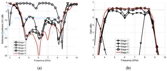 The proposed antenna performance in a design evolution process, as depicted in Figure 4. (a) Reflection coefficient (S11); (b) gains.