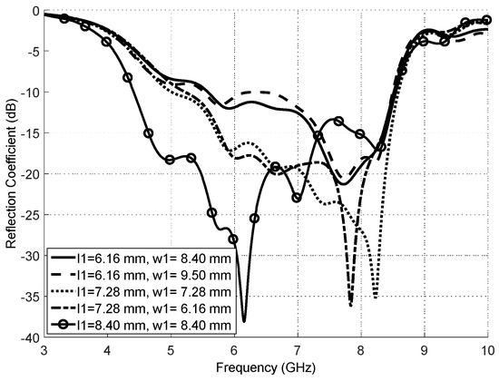 In the optimization process, the length l1 and width w1 of the radiating patches were varied simultaneously from 5 to 10 mm, with d1 = 1.68 mm, h1 = 3.048 mm and xvia = −3.5 mm (see Table 1). Examining the results, as displayed in Figure 6, it is seen that an increase in the size of the radiating patches causes the excitation of an upper resonance, occurring above 8.48 GHz. Increasing the size further causes the lower resonance (approximately 4.45 GHz) to disappear. Further, the results for the S11 parameter show that these two resonances are strongly excited when l1 = w1 = 8.4 mm.