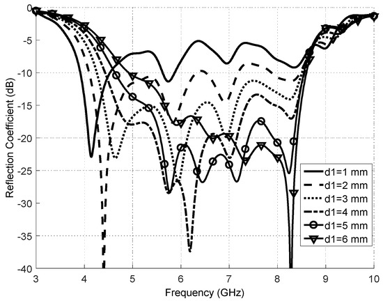 Variation in the space separating the parasitic elements (d1) was investigated next. This was varied over the range from 1.00 to 6.00 mm, while the other parameters were held at the optimum values that had been previously determined. The results of this investigation are shown in Figure 8, where it is observed that the bandwidth between the upper and lower resonances decreases as this spacing is increased. However, with the narrowest spacing (1.00 mm), the value of S11 over the intervening range of frequencies rises above −10 dB and hence is not acceptable for mobile applications. When d1 equals to 2 or 3 mm, an optimum situation is found, with sharp upper and lower resonances at an adequately wide separation, and S11 values across the intervening band that are acceptable for wideband operation. Beyond this value of d1, the bandwidth falls again and eventually the upper resonance becomes completely eliminated.