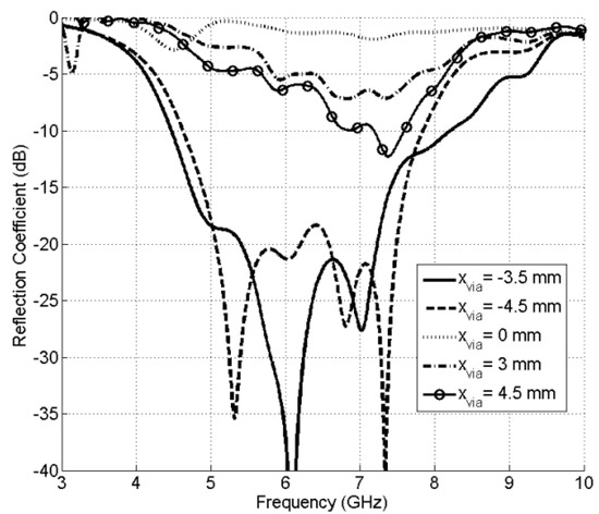 Reflection coefficient (S11) with different via (xvia) locations.