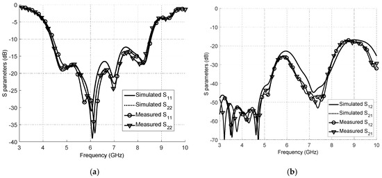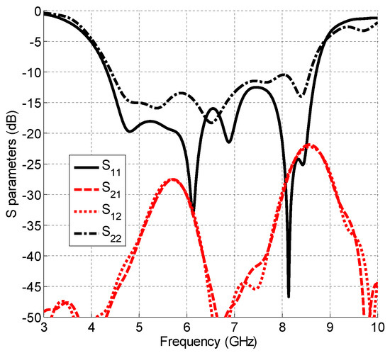 Furthermore, the alternative orthogonal configuration shown in Figure 3 was also investigated and all four S parameters were measured. The results of Figure 12 were similar to those above: over the band 4.78–8.40 GHz (3.7 GHz bandwidth), S11 and S22 are better than −10 dB. The values of S12 and S21 are all better than −21 dB over the required bandwidth, which exceeds the performance of the published works [18,19,20].