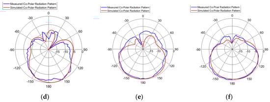Simulated and measured co-polar (Eθ) radiation patterns (θ-cut at φ = 0) at 5.5, 6.5, and 7.5 GHz for Port 1 and Port 2, where (a), (b), and (c) are for Port 1 and (d), (e), and (f) are for Port 2.