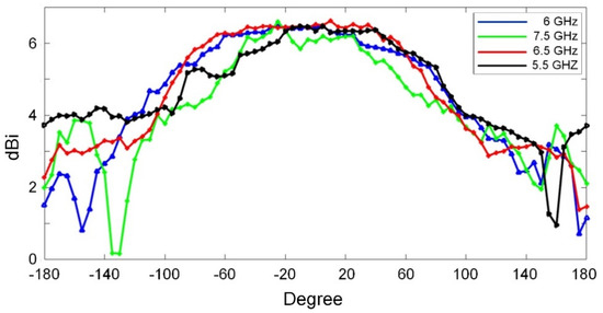 The measured gains of the WBMA are presented in Figure 15. It is seen that the measured gains fluctuate with the highest of more than 6 dBi. Generally speaking, due to the wider operational bandwidth, the gains have more variations with respect to frequency.