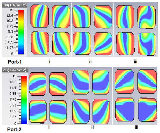 The simulated current distributions on the wideband MIMO antenna at several frequencies are presented in Figure 16. On the parasitic patches, the current is mainly distributed along the edges of the slots. The left–right asymmetry of these patterns confirms that the antenna is capable of supporting multiple resonant modes whose overlapping leads to the wideband characteristic. Because the parasitic patches are offset only in the x direction (along the feedline axis), the current patterns remain almost symmetric about this axis.