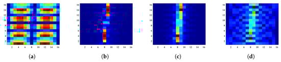Figure 4 depicts CS-MASK of each signal. The signal length is 256, the size of the original ambiguity function is , in comparison, the size of CS-MASK extracted according to Equations (14) and (15) is , meaning a great reduction of the feature size.