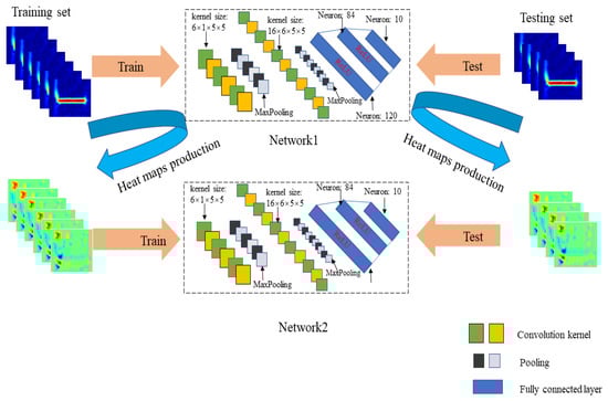 The proposed method can be compartmentalized into three main parts: initial training, saliency map production, and re-training. Firstly, the 2D transform feature of radar signals are divided into training set and testing set, then the training set is fed into a network1 as input to train it, and the testing set is used to measure the performance of network1. Secondly, all of the data are sent to forward propagate the well-trained network1 again, and then back propagate the error to the first hidden layer. In this way, a set of saliency maps for each 2D transform feature can be obtained. Thirdly, the saliency maps of original training set are sent to a new network with identical structure of network1 to do training. The performance of this new network can be measured by the saliency maps of original testing set. Figure 7 shows the flowchart of the proposed algorithm and Algorithm 1 elaborates the detailed steps of this algorithm.