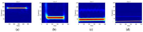 In real scenarios, there are numerous complex types of radar signals for different applications. According to types of radar transmission, signals can be divided into impulse radar signal, swept frequency radar signal, and continuous-wave radar signal [24]. According to the modulation mode, the radar signal can be divided into analog modulated signal and digital modulated signal. Analog modulation includes linear frequency modulation, quadrature amplitude modulation (QAM), triangular frequency modulation, and etc. [25]. Digital modulation includes binary phase shift keying (BPSK), quadrature phase shift keying (QPSK), 8 phase shift keying (8PSK), and etc. Besides, ultra wide bandwidth (UWB) signal has been used successfully in radar systems for many years [26]. In this experiment, four datasets are selected. In each dataset, the signals are set with the same parameters (such as radio frequency and frequency modulation mode) and transmitted by 10 radars of same type produced by the same manufacturer. 10 types of 500 approximate single-frequency signals from 10 civil aviation meteorological radars are involved in Database I. Database II contains 10 types of 500 single-frequency signals from 10 radar generators. Database III and database IV include 10 types of 500 (LFM) signals gleaned from radar signal generators. The time sampling points of each signal is in length of 500. The reasons why these databases are selected are because (1) they are typical and representative radar signals in SEI; and, (2) limited by experimental conditionals, signals with more complex modulation are unavailable for us. We randomly select a signal from each dataset to show its STFT in Figure 8.