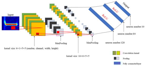The structure of CNN influences the final recognition effect greatly, hence, some extraordinary artificial intelligence professions delved into network structure and numerous effective network structures were designed, like LeNet-5 designed by Yann LeCun [27], AlexNet proposed by Hinton and Alex Krizhevsky [28], VGG proposed by Oxford Visual Geometry Group [29], GoogleNet proposed by Christian Szegedy [30], and etc.. It should be noted that this paper focuses on studying “what” is learned by a certain network other than the difference between various networks. Accordingly, LeNet-5, a very simple and effective CNN is used as classfier in this paper. Figure 9 shows the structure of LeNet-5 which contains 7 hidden layers: 2 convolutional layers, 2 pooling layers, and 3 fully connected layers. It should be pointed that this kind of parameters setting is only suitable for STFT and MC-feature. As for AF-RS and CS-MASK, the parameters of convolutional kernel and fully connected layers should be adjusted according to the size of these two features.
