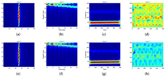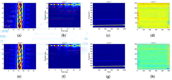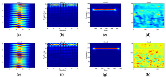 (a–d) are the AF-RS, CS-MASK, STFT, and machine cognition (MC)-feature feature of a signal of class 1 in dataset I; (e–h) are respectively features of a signal of class 2 in dataset I.