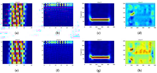 (a–d) are the AF-RS, CS-MASK, STFT, and MC-feature feature of a signal of class 8 in dataset II; (e–h) are respectively features of a signal of class 9 in dataset II.