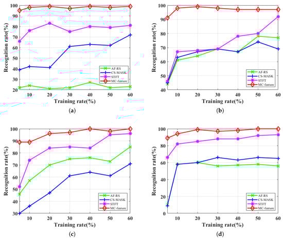 In order to verify the superiority of the proposed algorithm, AF-RS, CS-MASK, STFT, and Machine Cognition Based feature are sent into LeNet 5 to recognize. We set , , and training rate from to . Table 1, Table 2, Table 3 and Table 4 show the recognition rate of each dataset. Figure 14 exhibits the recognition rate and training rate curves of different features in each data set. In general, the proposed feature obtains a very high recognition rate when compared with other features in each dataset, even the training rate is low. For dataset I, AF-RS cannot provide the network with enough useful information, leading to a result that 10 types of signals are divided into only 2 class; hence, the recognition rate retains approximately no matter how training rate changes. For dataset II and dataset III, AF-RS and CS-MASK contain some information that is conducive to the recognition task of network; however, the recognition rate declines obviously when the training rate is below . In addition, even the training rate is over , the network cannot learn more information from AF-RS and CS-MASK. It is probably because these two features may lose some detailed texture information at cost of dimensionality compression. Similar phenomenon also appears in dataset IV that the recognition rate is only of AF-RS and CS-MASK when the training rate is , which means that the network learns nothing from these two features. In four datasets, the performance of STFT is relatively stable, but still much lower than that of the proposed feature, especially when the training rate is less than .