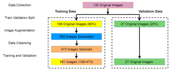 Google Colab execution runtime with GPU has been used to train, validate, and assess the performance of the segmentation model. UNBCSM was trained with 581 images which includes 108 original images and 473 images obtained by image augmentation techniques. The split validation technique was used instead of the N-fold cross validation technique, since the augmented images of the validation set present in the training set will over-fit the segmentation model. To avoid this issue, 20% of the original images, 27 images were randomly selected and kept exclusive for validation. The details about the number of images used at each stage are shown in Figure 5.
