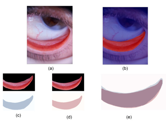 With the aim of estimating the performance of the trained model, we compared for each sample the proposed segmentation results with the manually selected ROI according to the IoU score. The latter process is resumed in Figure 7 utilizing a sample from the test set. Figure 7a displays the original eye image; Figure 7b shows the overlay of the original sample and the manually selected ROI providing the label or ground truth for training. In Figure 7c, we show the cropped region of the manually segmented region and its corresponding mask. The segmentation output from the trained model as shown in Figure 7d,e is the overlay of Figure 7c,d for a better understanding of segmentation results.