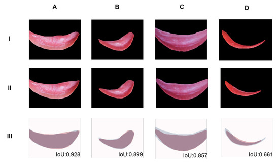 Four samples (A–D) of the segmentation results. Row I: The manually segmented conjunctive region, Row II: Segmented conjunctive region by the model, and Row III: Overlay of both the masks and IoU.