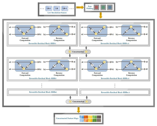 It is important to retain the spatial information of the videos. The spatial information assures that the low-resolution frames and the generated high-resolution frames have maximum structural similarity. We achieved this by building the spatial generator using reversible residual blocks . The helps in retrieving and reconstructing the spatial features without any loss. The are constructed in parallel and the output feature maps from every block at each level is concatenated and sent to the next level, which trains them by comparing and learning the differences between low-resolution and high-resolution frames. The RRBs are shown in Figure 2 where every consists of a forward and a reverse computation. F and R are the forward and reverse residual functions. These functions are composed of convolutions, batch normalization layers and a rectified linear unit with a residual block having stride 1 to preserve information and avoid loss. In Figure 2 and can be considered as input features and and are the output features produced from the additive coupling rule [35,36]. The output features and can be computed as in (2). These reversible residual blocks reduce the memory footprint which helps us to work with large video datasets without any degradation in performance.