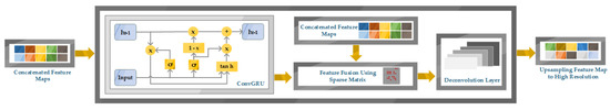 The concatenated feature maps generated by the spatial generator are fed to the convolutional gated recurrent unit (ConvGRU) of the temporal generator. The ConvGRU retains the temporal information and consistency of each video frame. ConvGRU is computationally less expensive and acquires less memory than general long short term memory (LSTM). The convolutional GRU takes the linear GRU for computation and simply replaces the multiplication of matrix with convolutions. With as input feature at time t, the ConvGRU [10] can be represented by the following equations (Equations (4)–(6)):